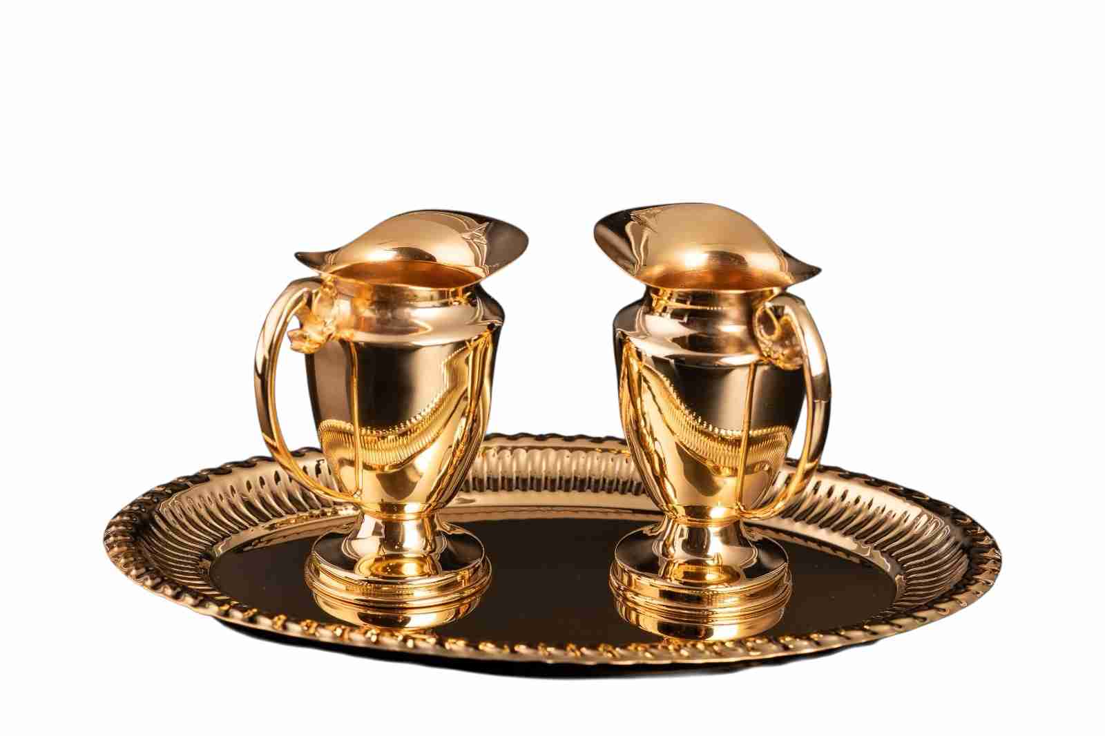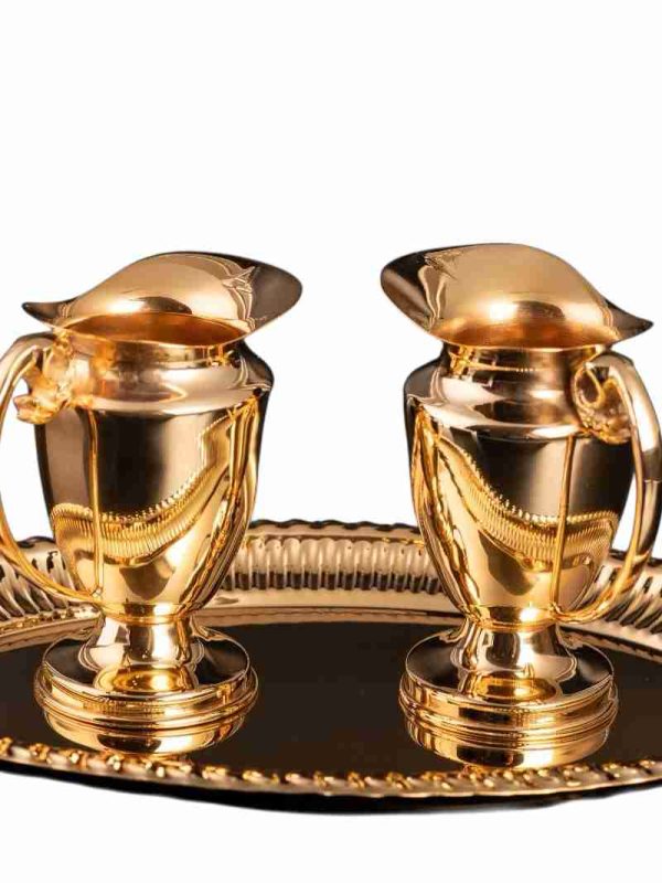 Sastoji se od dvije posude: jedne za vodu i jedne za vino. Proizvod je namijenjen liturgijskoj uporabi tijekom slavlja Euharistije, posebno za pranje ruku svećenika (lavabo) i za pretvorbu vina tijekom svete mise.